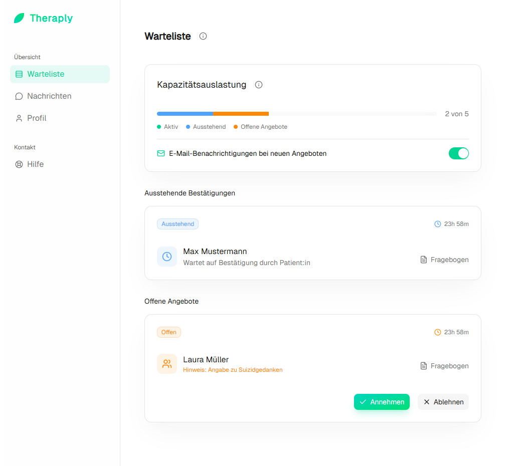 Theraply verbindet Sie mit Patient:innen, die aktiv nach Unterstützung suchen und zu Ihren Angebot passen. Ohne eigene Website, ohne Werbeaufwand.